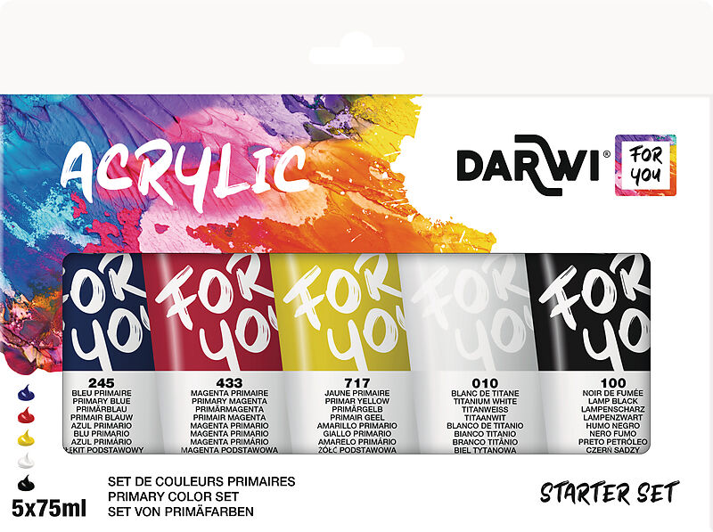 FY - Acrylfarbe Darwi For You, Acrylfarbe, Set 5x75 ml Starterset Darwi For You mit 5 strahlenden Farbtönen à 75 ml mit einer cremigen, seidenmatten Textur. Eine sorgfältige Auswahl hochkonzentrierter, lichtbeständiger Pigmente, die der Farbe eine unvergleich...