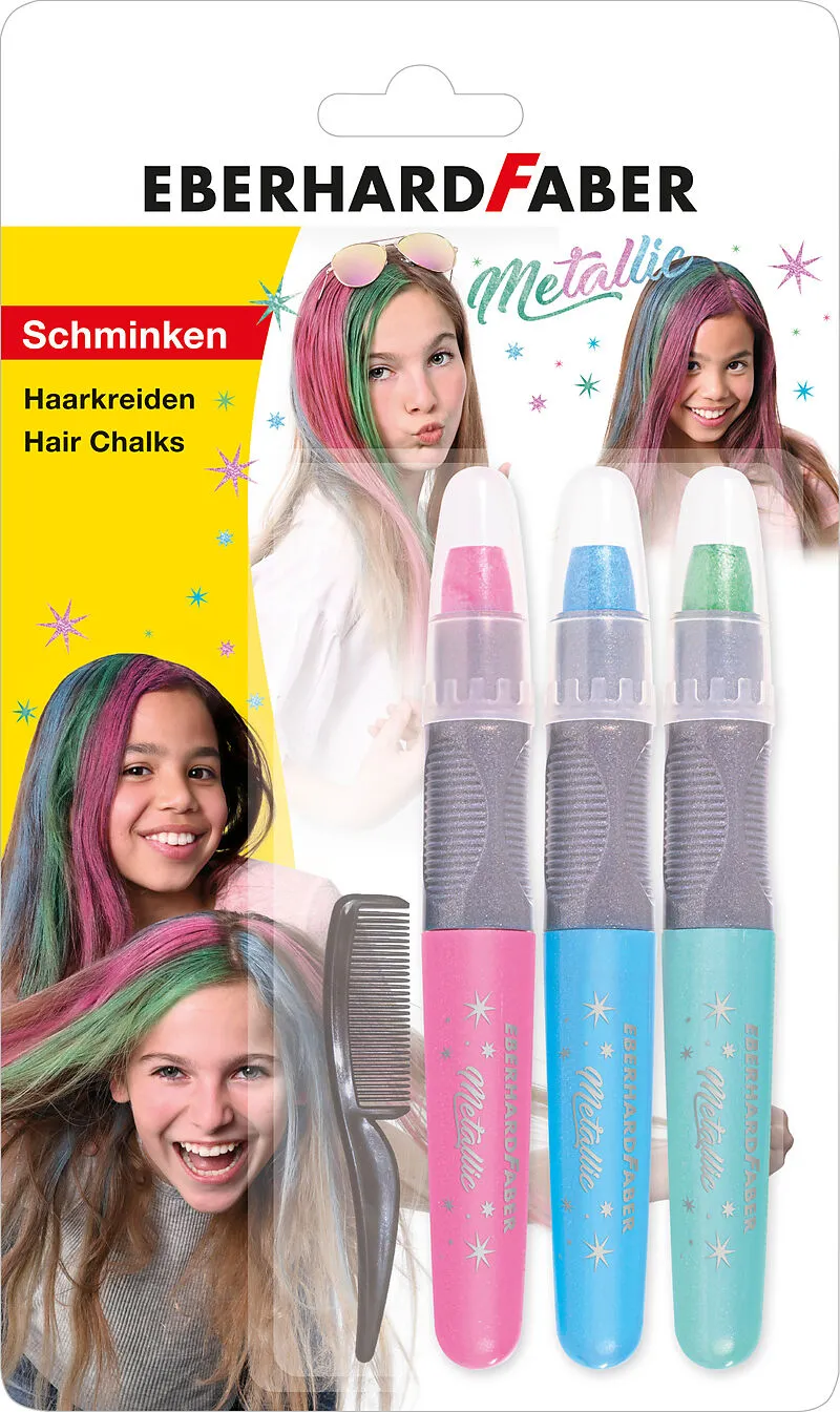 Haarkreide Metallic, Set mit 3 Farben + Haarkamm Einmal ein Tiger sein, Dracula oder eine Prinzessin! Einmal mit einem angesagten Tattoo in die Schule gehen! Schminkfarben für Kinder machen Träume wahr. Sie sind der Hit auf Geburtstagsfesten, Faschings- oder ...