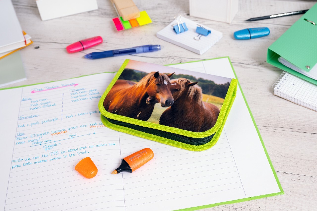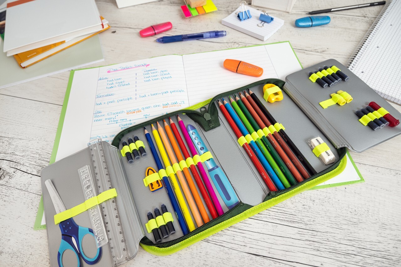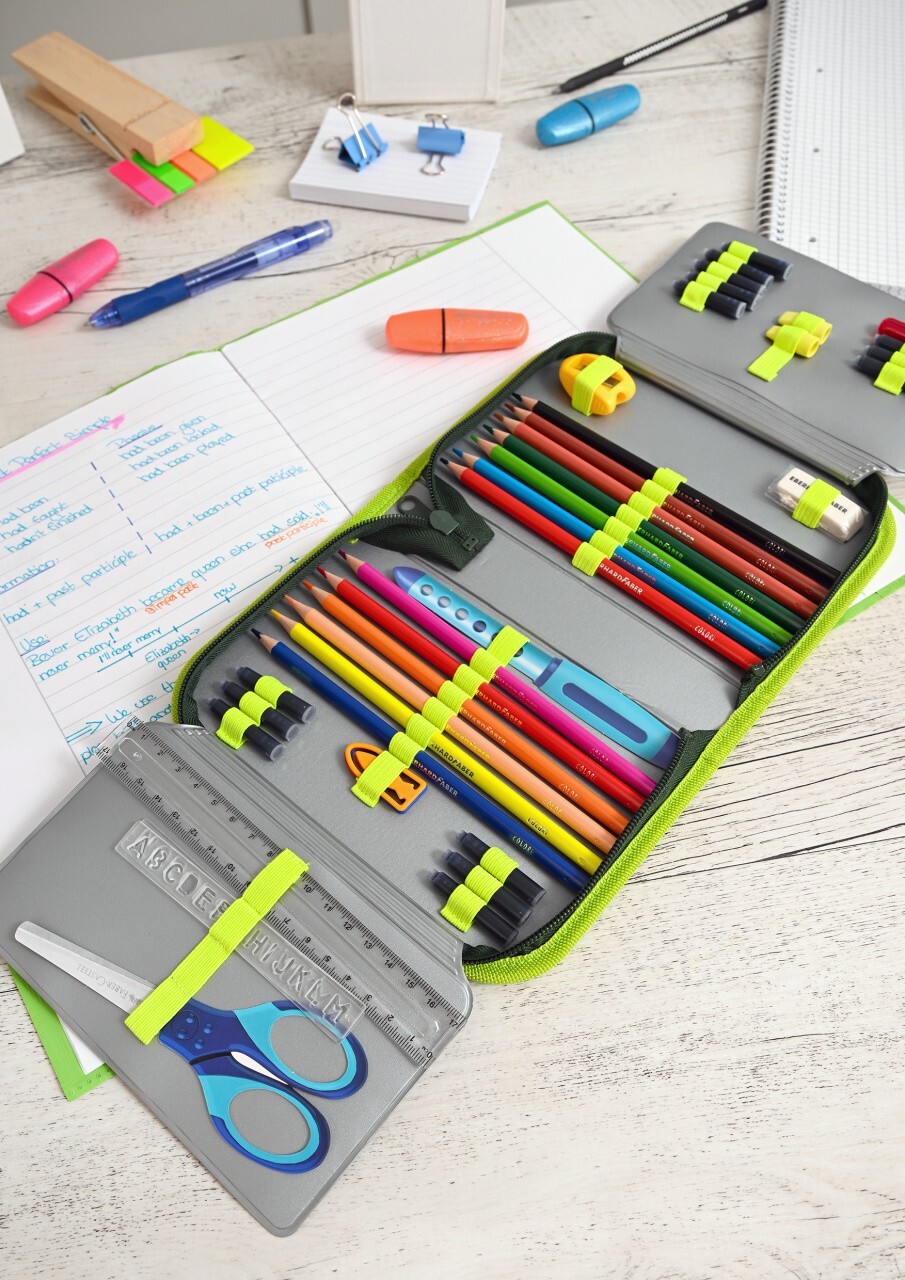 Federmäppchen gefüllt mit 42 Teilen in trendigen Designs; 2 Innenklappen für viel StauraumInhalt: 12 Buntstifte hexagonal, 1 Bleistift hexagonal, 14 blaue Tintenpatronen, 1 Spitzer, 1 Radierer, 1x 16 cm Lineal, 1 Füllerattrappe, 2 ABC Schablonen, 1 Stundenplan...