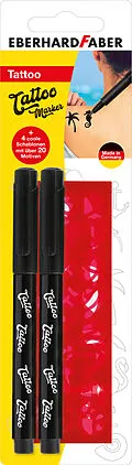 Tattoostifte 2er Blisterkarte Enthält 2 Stifte und 4 Schablonen mit über 20 Motiven im Set. Tattoo bleibt bis zu 60 Stunden sichtbar. Unterschiedliche Farbwirkung je nach Hauttyp. Die Trocknungszeit beträgt ca. 5 Minuten und ist auswaschbar aus den meisten Te...