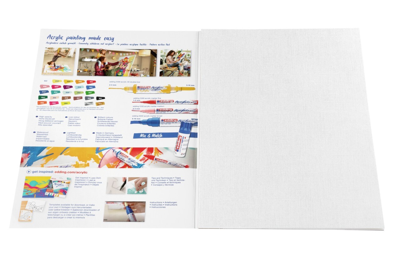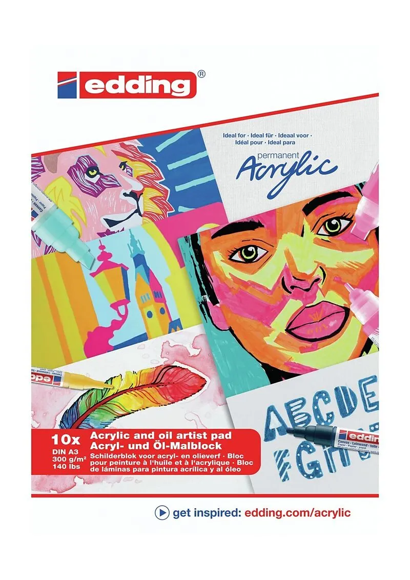 weißAcryl- und Ölmalblock mit 10 Blättern weißem A3-Papier (300 g/m). Einzigartige Papierqualität, speziell auf die Eigenschaften der edding Acrylprodukte abgestimmt. Einzigartige feine Leinenprägung, die an die Textur von Leinwand erinnert. Die besondere Besc...