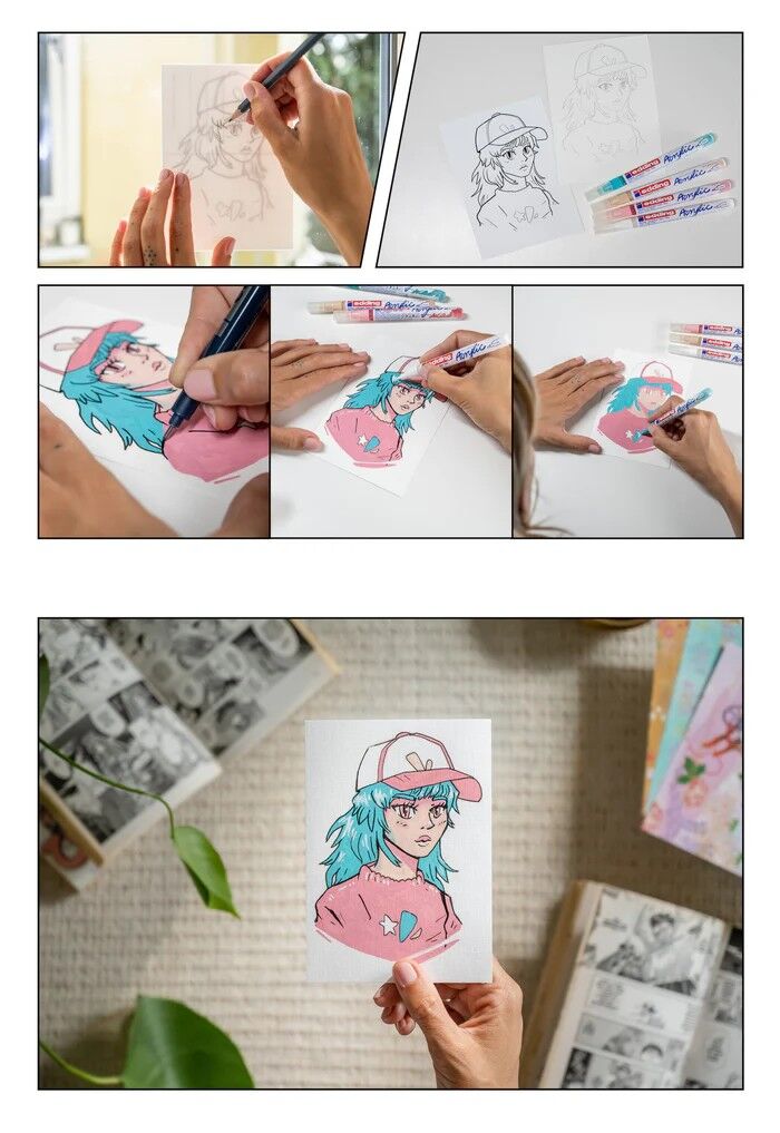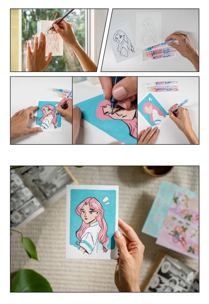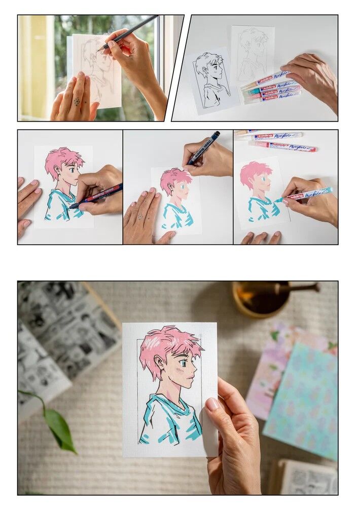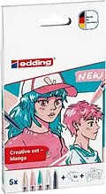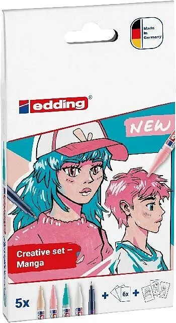 Komplettes Manga Stifte Set: Enthält 4x e-5300 Acrylmarker in lebendigen Farben (1-2mm), 1x e-1800 Profipen in Schwarz (0,7mm), 6 Blankokarten, 3 Vorlagen und eine Schritt-für-Schritt-Anleitung. Geeignet für Anfänger oder erfahrener Künstler. Hochwertige bunte...