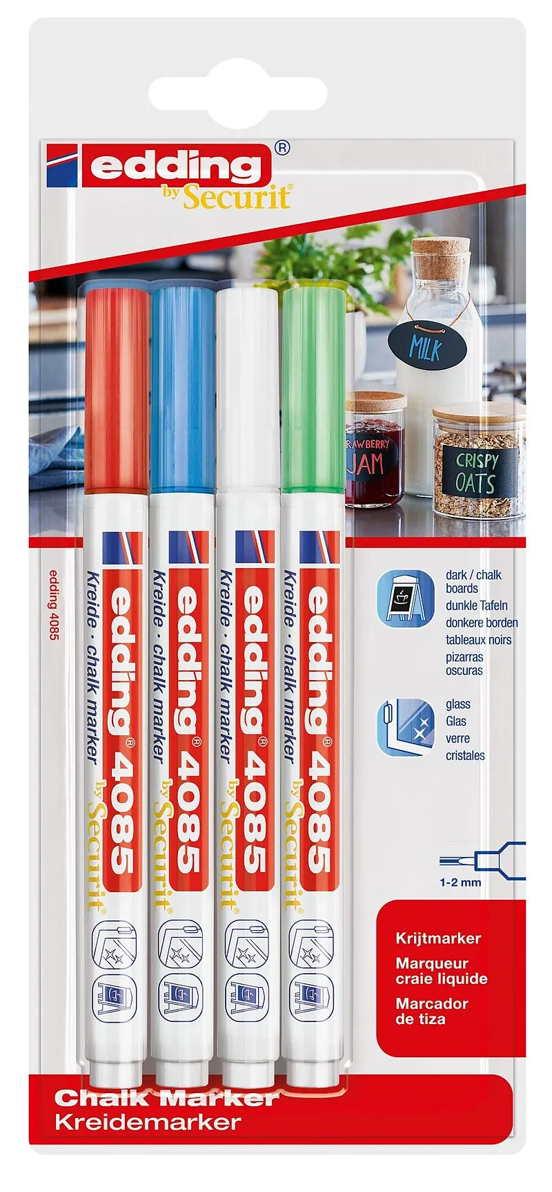 Kreidemarker 4085. Kreidemarker für die nicht-permanente Gestaltung, Dekoration und Beschriftung von geschlossenen Oberflächen, z. B. Fenster, dunkle Tafeln, Glas, plexiglas und Spiegel. Gut deckende, geruchsneutrale Flüssigkreide auf Wasserbasis. Feucht abwis...