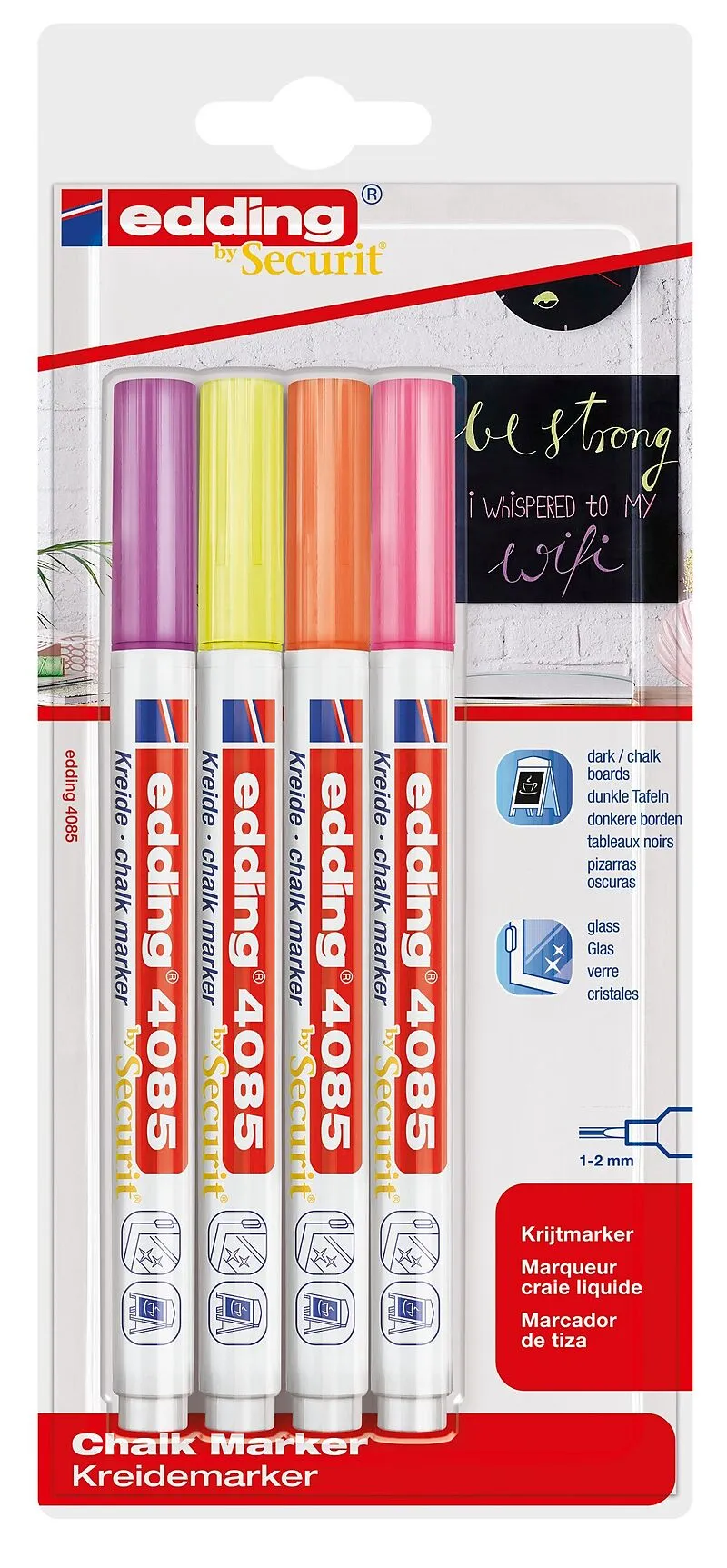 Kreidemarker 4085. Kreidemarker für die nicht-permanente Gestaltung, Dekoration und Beschriftung von geschlossenen Oberflächen, z. B. Fenster, dunkle Tafeln, Glas, plexiglas und Spiegel. Gut deckende, geruchsneutrale Flüssigkreide auf Wasserbasis. Feucht abwis...