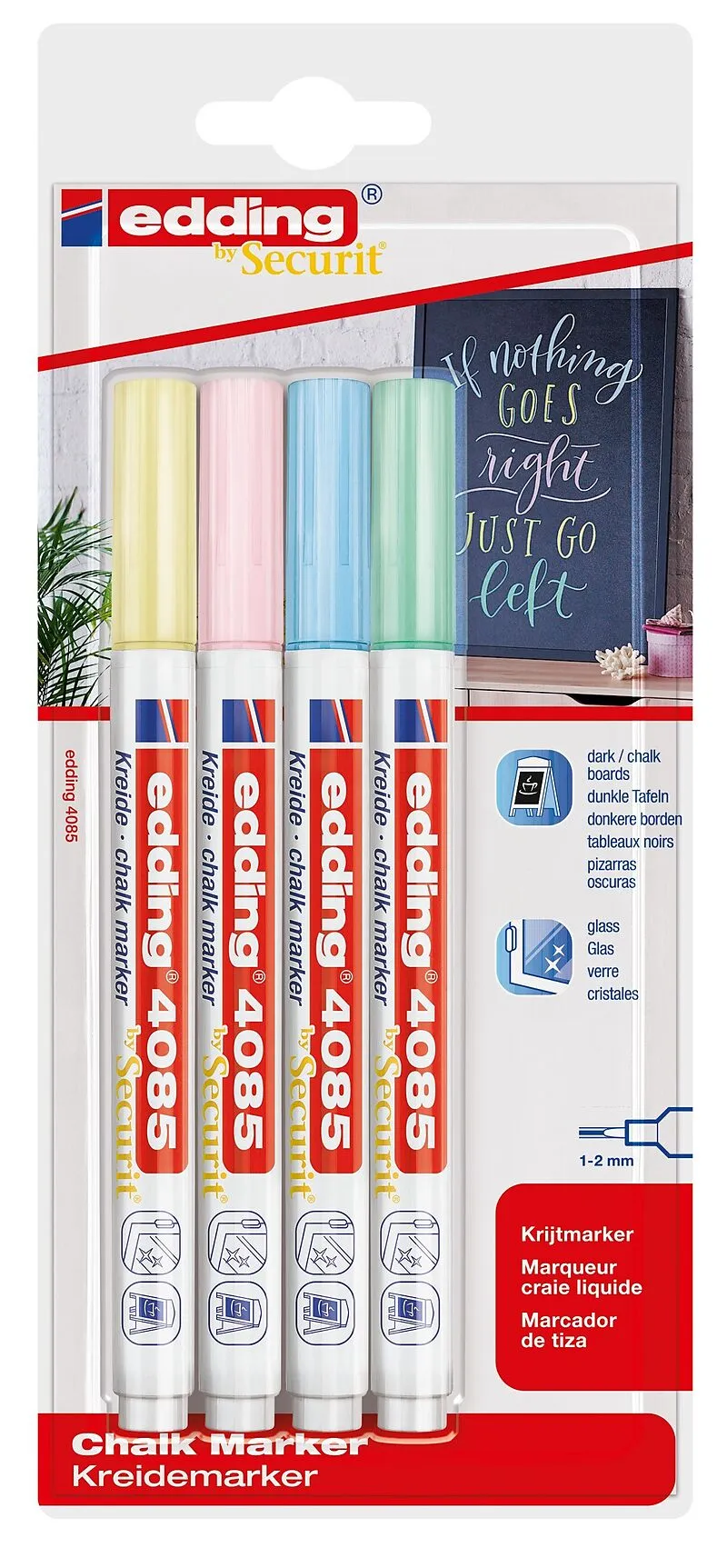 Kreidemarker 4085. Kreidemarker für die nicht-permanente Gestaltung, Dekoration und Beschriftung von geschlossenen Oberflächen, z. B. Fenster, dunkle Tafeln, Glas, plexiglas und Spiegel. Gut deckende, geruchsneutrale Flüssigkreide auf Wasserbasis. Feucht abwis...