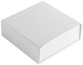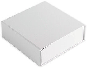 Hochwertige, weisse Geschenkbox aus Karton. Mit Magnetverschluss. Flach angeliefert und dank Haftklebestreifen einfach aufzustellen.