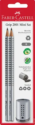 Das GRIP 2001 Mini Set enthält zwei GRIP 2001 Bleistifte mit ergonomischer Dreikantform und eine farbig passende Mini Einfachspitzdose.