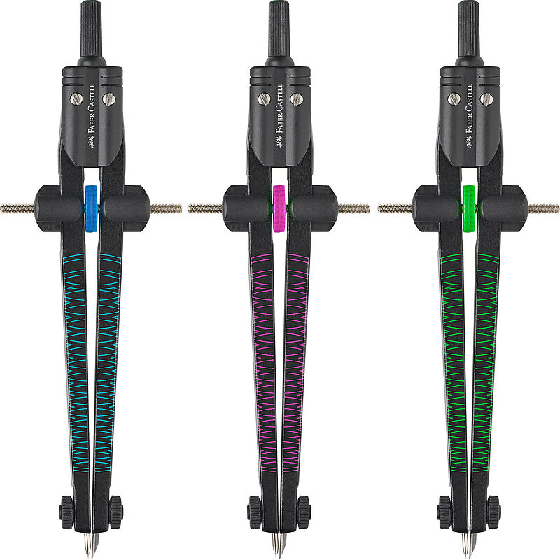 Schnellverstellzirkel TWISTER im Design 2013. Robuste Zahnradführung im gerillten Zirkelkopf. Rutschfeste Nadel- und Minenklemmung. Für Kreise bis Ø 340 mm. Inkl. Ersatzteildose. Neue Farbsortierung.