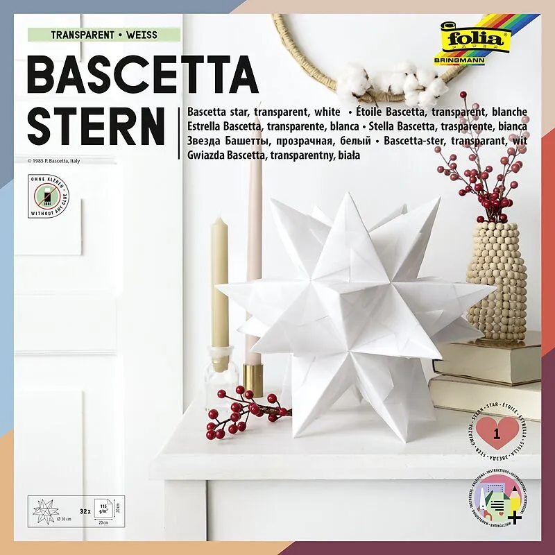 Bascetta Stern Set mit 32 Transparentpapierzuschnitten in 20x20cm, 115 g/qm, vollflächig weiß transparent, zum Falten und Zusammenstecken eines 3D-Origamisterns, inkl. ausführlicher Anleitung und Bastelvideo, für Kinder aufgrund des Schwierigkeitsgrades nur be...