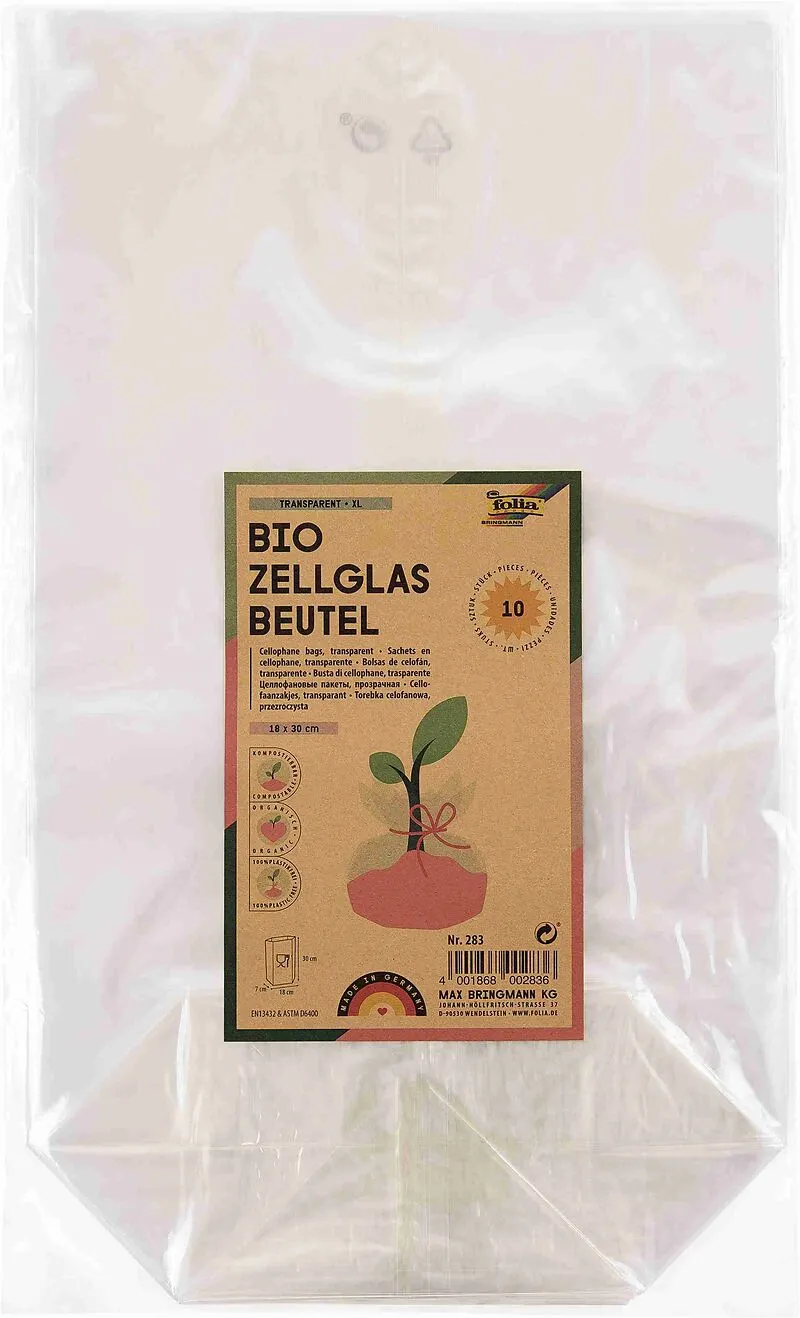 Zellglasbeutel aus lebensmittelechtem Zellglas/ Cellophan, transparent ohne Druck, 180x300mm, 10 Stück, verpackt im Polybeutel mit farbig bedrucktem Etikett Um selbstgemachte Leckereien oder auch Gewürze, Tee, u.v.m, gekonnt in Szene zu setzten, eignen sich di...