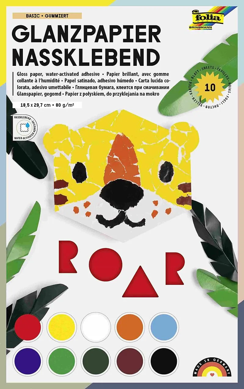 4-farbige Mappe aus Karton, 18,5x29,7cm, 10 Farben sortiert, rot, orange, gelb, weiß, hellblau, dunkelblau, hellgrün, dunkelgrün, braun, schwarz (Farbänderungen möglich), mit Gummierung Buntpapiermappe, 18,5 x 29,7 cm, 10 Blatt, 10 farbig sortiert, Farben rot,...