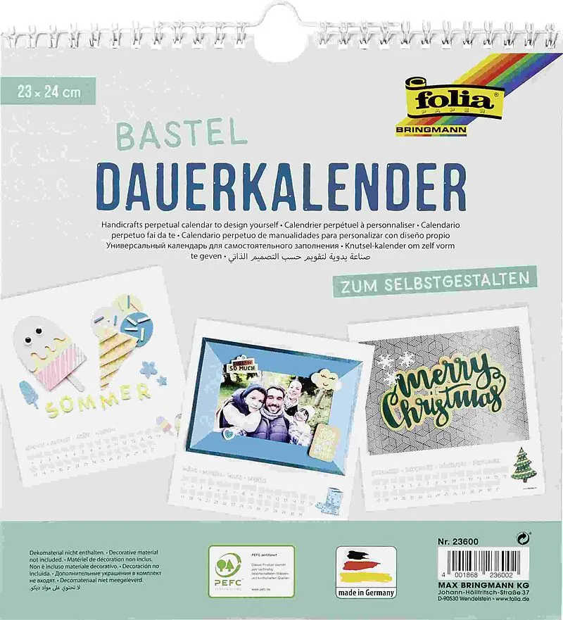 Dauerkalender, Format 23x24cm, Spiralbindung kopfseitig, Papier weiß, Druck schwarz, Grammatur 220 g/qm, 12 Monatsblätter und 1 unbedrucktes Blatt, für Bilder bis 13x18cm geeignet Dauerkalender mit weißen Kalenderblättern, ideal geeignet zum Selbstgestalten, z...