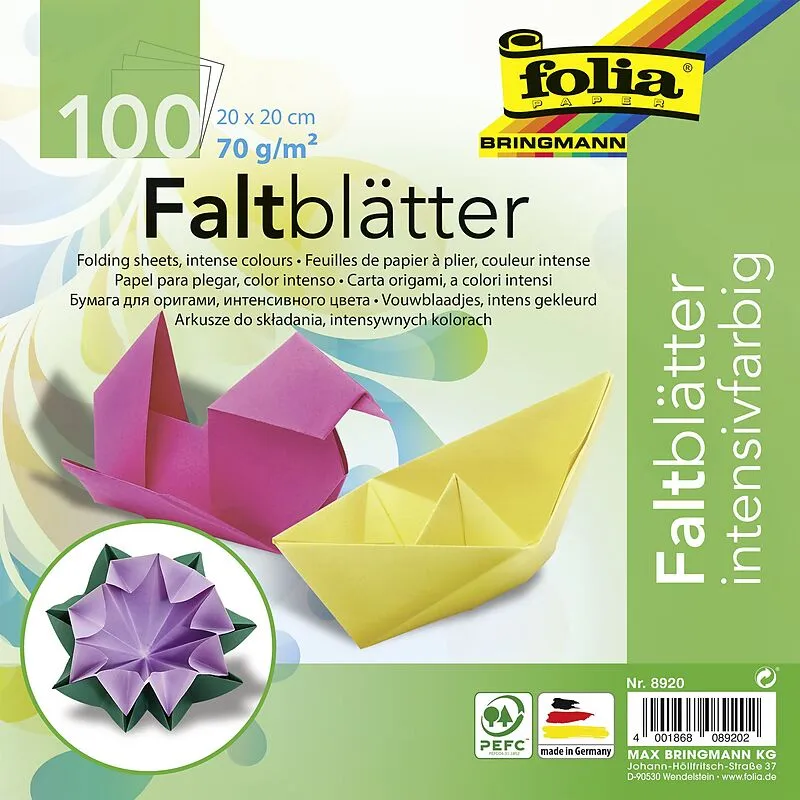 Faltblätter 70g/qm, 20x20cm, 100 Blatt in 10 verschiedenen Farben, durchgefärbt, durch das Falten entstehen aus den quadratischen Blättern 2- oder 3-dimensionale Origamitiere, Papiergirlanden, Fensterbilder, Sterne und andere Figuren. Faltarbeiten fördern die ...