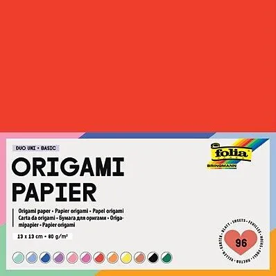Faltblätter aus Origamipapier 80g/qm, 96 Blatt im Format 13x13cm, farbig sortiert Faltblätter aus speziellem 80g/qm Origamipapier, 96 Blatt in 12 Farben sortiert, 13x13cm, verpackt im Polybeutel mit 4-farbig bedrucktem Deckblatt.