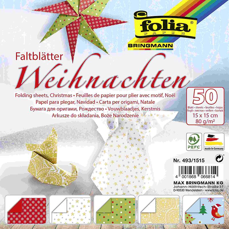 Faltblätter 80g/qm, 50 Blatt in der Größe 15x15cm, in weihnachtlichen Motiven sortiert, verpackt im Polybeutel mit 4-farbig bedrucktem Deckblatt, LGA tested, Made in Germany 50 Faltpapiere in der Größe 15 x 15 cm, mit 5 verspielten Weihnachtsmotiven wie Grün m...