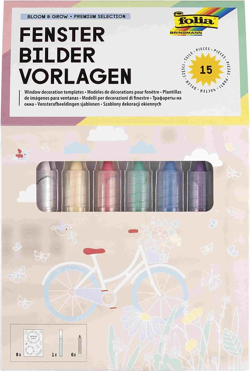 Fensterbildervorlagen aus Papier im Format ca. 50x70cm, zum Hinterkleben von Glasscheiben oder transaprenten Oberflächen, Konturen können dann mit dem beiliegenden Kreidemarker oder den Kreidestiften ausgemalt werden und so auf die Oberfläche übertragen werde...
