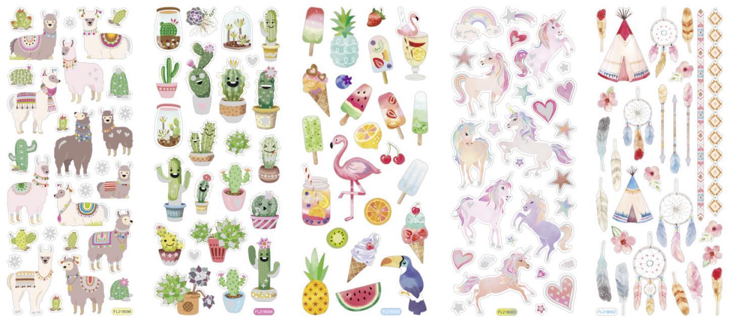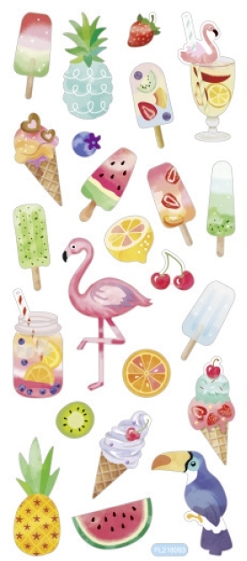 Glitzer-Sticker Exotic. Hochwertige Sticker auf transparentem Trägermaterial, mit Gliterapplikationen verziert. 5 Blatt, ca. 10x23 cm, Motive sortiert. Geeignet zum Basteln, Verzieren, Gestalten, uvm. Für alle die gerne Kreativ sind. LGA tested.