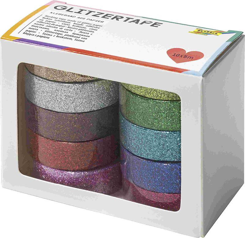 Set aus 10 Glitzertapes, selbstklebend, 15mmx5m, je 1 Rolle gold, silber, rotbraun, hochrot, pink, hellgrün, dunkelgrün, pazifikblau, dunkelblau, rosa, 10 Rollen in einer 4-farbig bedruckten Faltschachtel, Material Papier Set aus 10 Glitzertapes aus selbstkleb...