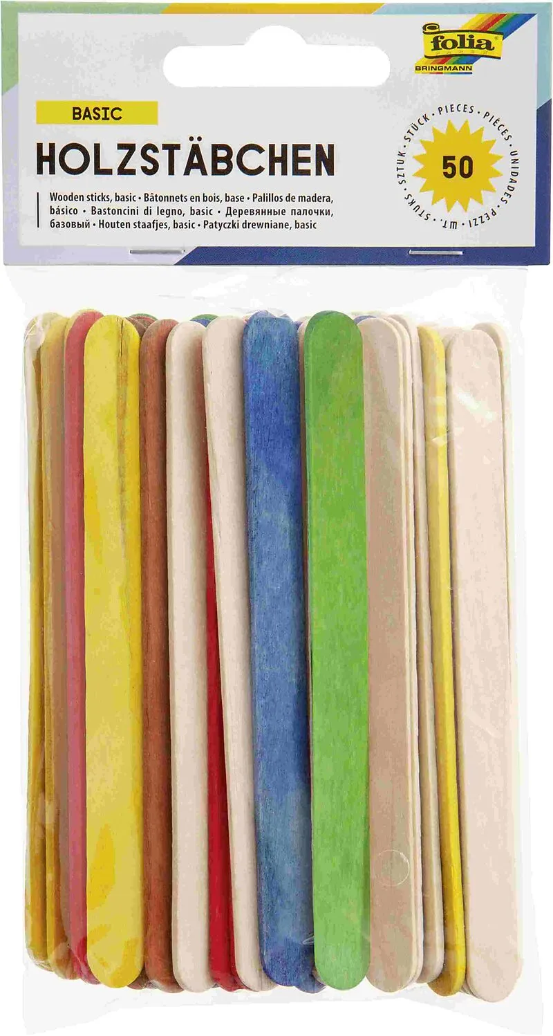 Holzstäbchen, 50 Stück, je 25 Stück farbig sortiert und 25 Stück naturfarben, Format 114x10x2mm, verpackt im Polybeutel mit 4-farbigem Reiter Die flachen Holzstäbchen haben ein Maß von 114 x 10 x 2 mm und sind an den Enden abgerundet. Verpackt sind diese zu 50...