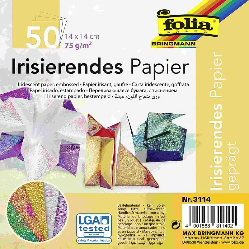 Folia Irisierendes Papier 75g/m, 14x14cm, 50 Blatt, 2 Prägungen farbig sortiert