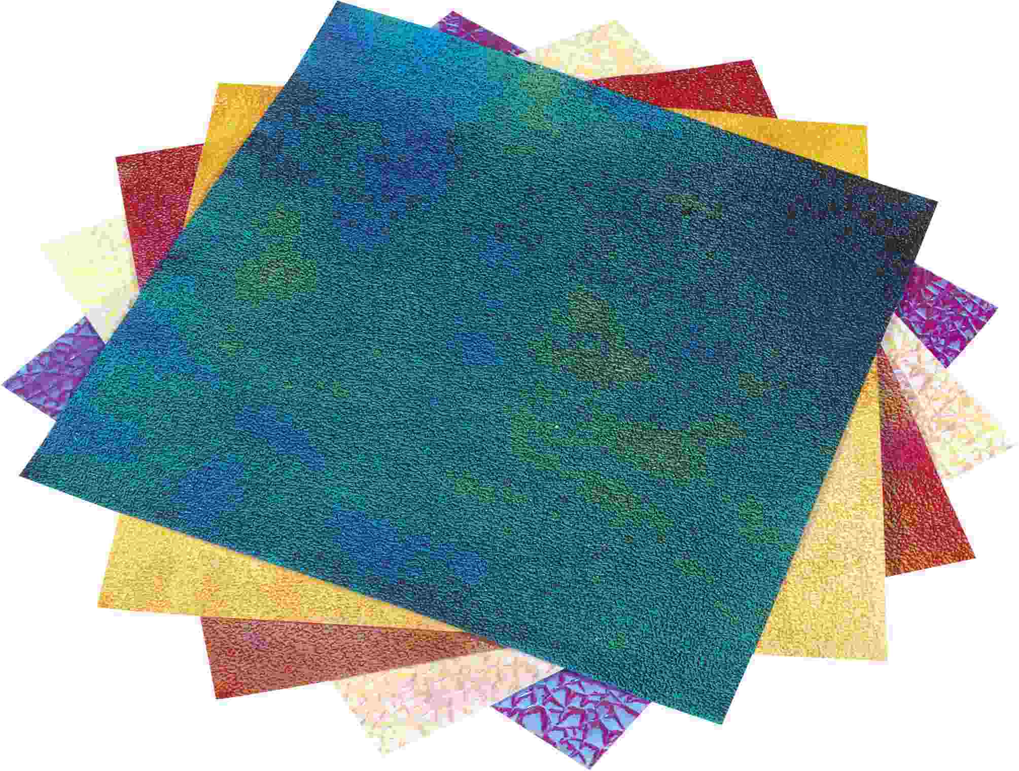 Irisierendes Papier 75g/m, 14x14cm, 50 Blatt, 2 Prägungen farbig sortiert.