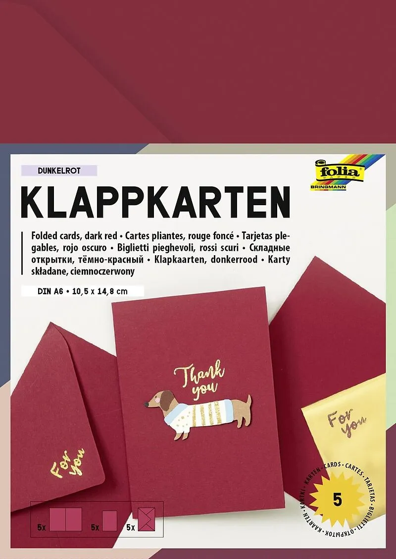 Das Set enthält jeweils 5 Doppelkarten in dunkelrot aus Tonkarton 220 g/qm, Format 10,5x15cm doppelt hoch, rechteckig, inklusive 5 passenden Kuverts und 5 Einlegeblättern in dunkelrot, ideal geeignet zum Bemalen, Bekleben und Verzieren Ihrer selbstgestalteten ...