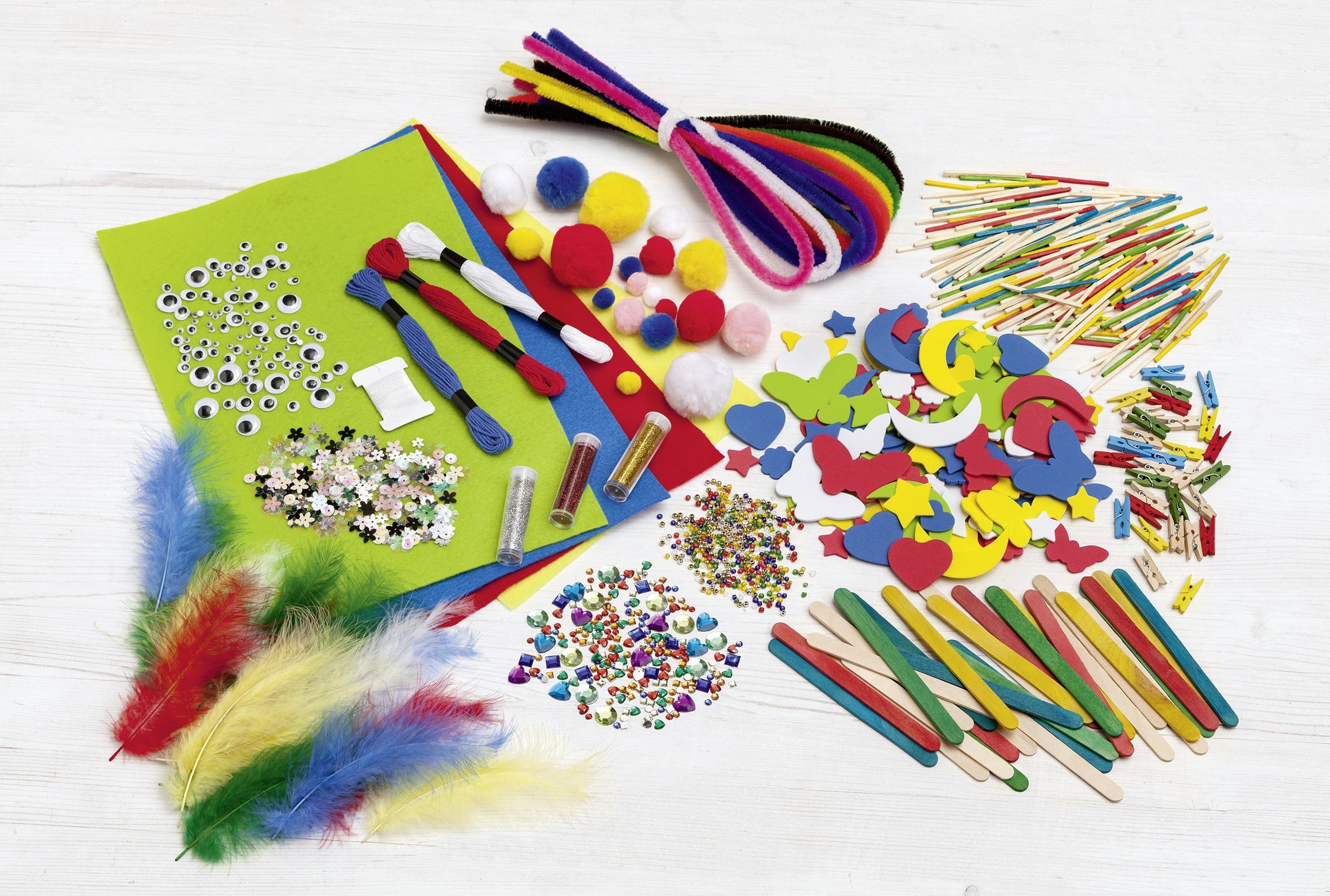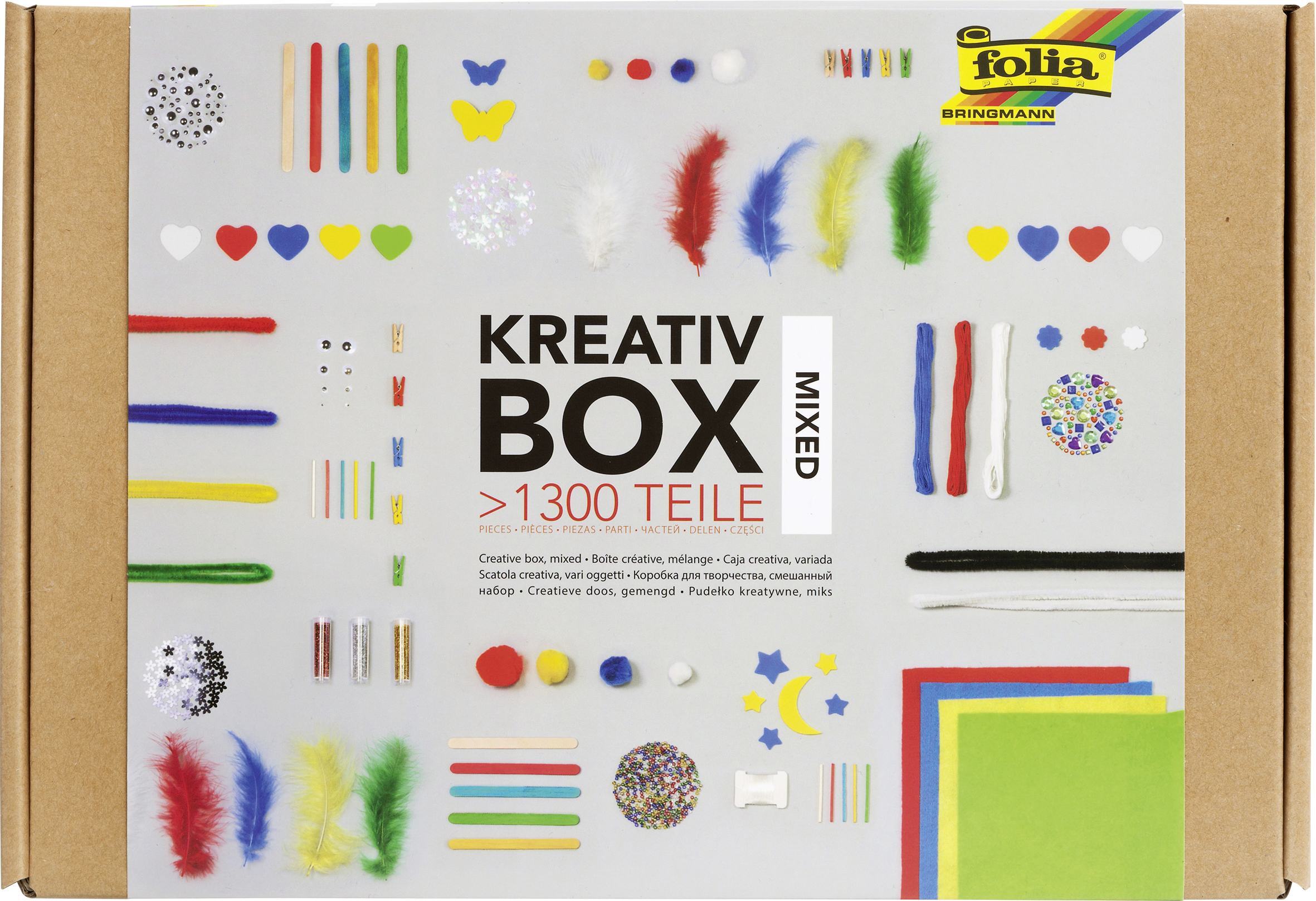 Kreativ Box Material Mix Kreativ Box Bunter Materialmix für phantasievolles und kreatives Basteln und Dekorieren.Inhalt:100x Wackelaugen, verschiedene Grössen4x Bastelfilz 20 x 30 cm, 150 g/m2, farbig sortiert150x Moosgummistanzteile200x Schmucksteine10x Cheni...
