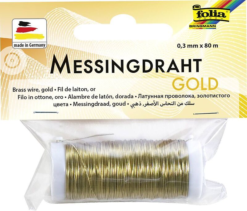 Messingdraht, Farbe: gold, Durchmesser 0,3mm, Länge 80m, aus Messing, auf Spule Goldener Messingdraht, Durchmesser von ca. 0,3 mm und ca. 80 m Länge, perfekt geeignet für Bastelarbeiten aber auch zur Schmuckherstellung.