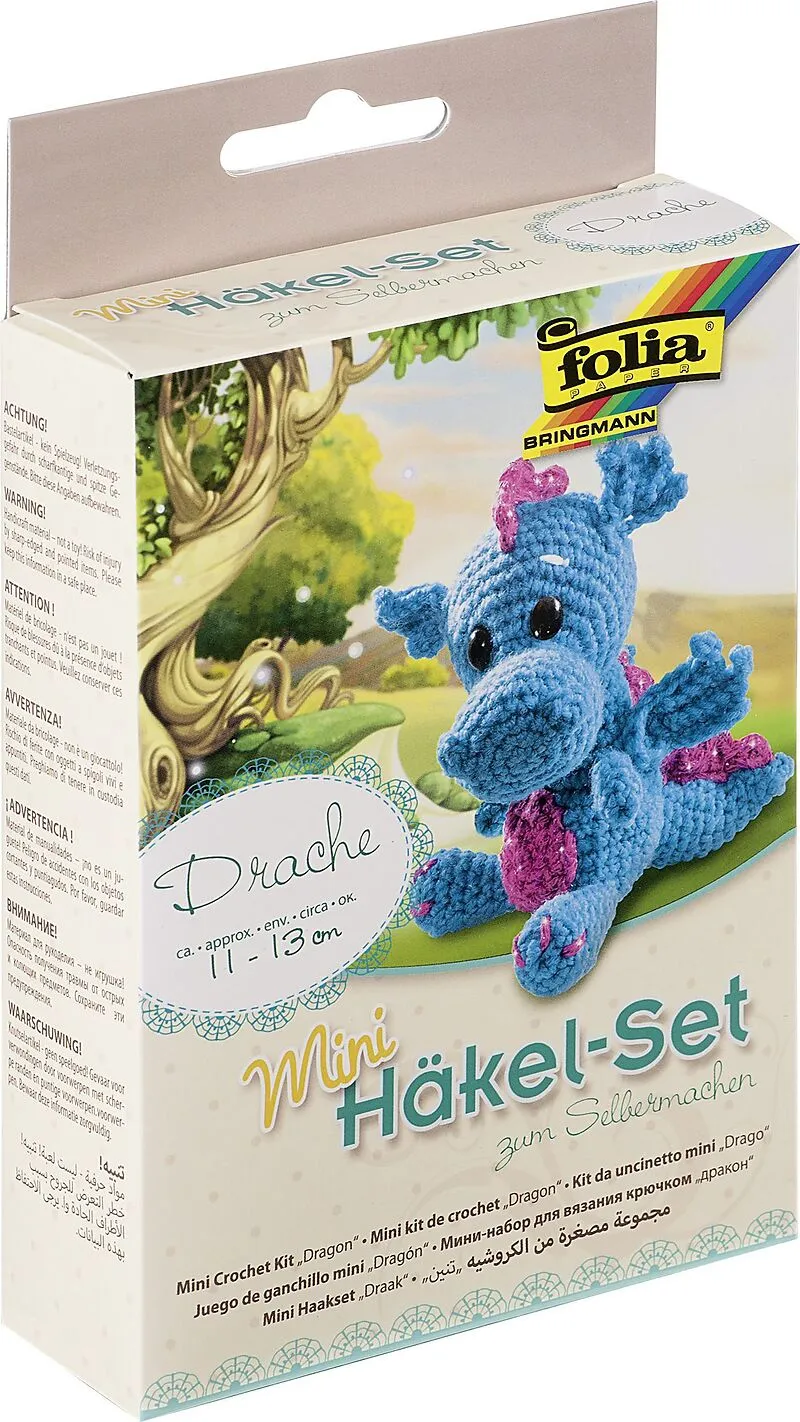 Mini-Häkelset "Drache", komplettes Set zur Herstellung eines selbstgehäkelten Drachens ca. 12 - 14 cm groß, Inhalt: 1 Häkelnadel, 15 g Wolle türkis, 5 g Wolle magenta mit Glitter, 2 Sicherheitsaugen 6mm, 10 g Füllwatte, 1 ausführliches Anleitungsheft 4-farbig,...