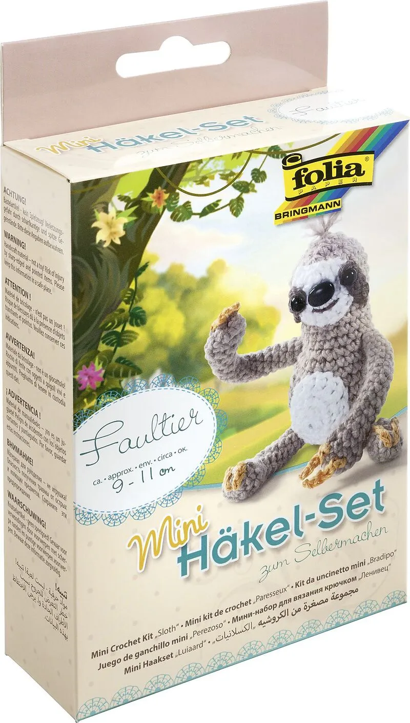 Mini-Häkelset "Faultier", komplettes Set zur Herstellung eines selbstgehäkelten Löwes ca. 9 - 11 cm groß, Inhalt: 1 Häkelnadel 2,5 mm, 15 g Wolle beige, 5 g Wolle weiß, 2 Sicherheitsaugen 6 mm, 1 Sicherheitsauge 10 mm, 10 g Füllwatte, 2 Baumwollgarn ocker & du...