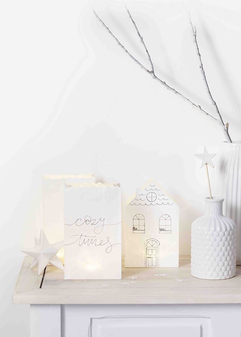 5 Lichtertüten aus Papier, 19 x 11,5 x 7 cm, Blanko weiß, schwer entflammbar, verpackt im Polybeutel mit 4 - farbigem Einleger. Lichtertüten aus Papier eignen sich hervorragend für Dekorationen des Innen- und Außenbereiches für Parties, Terrasse und Garten, Ge...