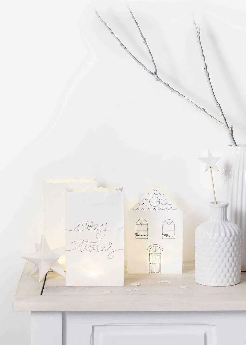 5 Lichtertüten aus Papier, 19 x 11,5 x 7 cm, Blanko weiß, schwer entflammbar, verpackt im Polybeutel mit 4 - farbigem Einleger. Lichtertüten aus Papier eignen sich hervorragend für Dekorationen des Innen- und Außenbereiches für Parties, Terrasse und Garten, Ge...