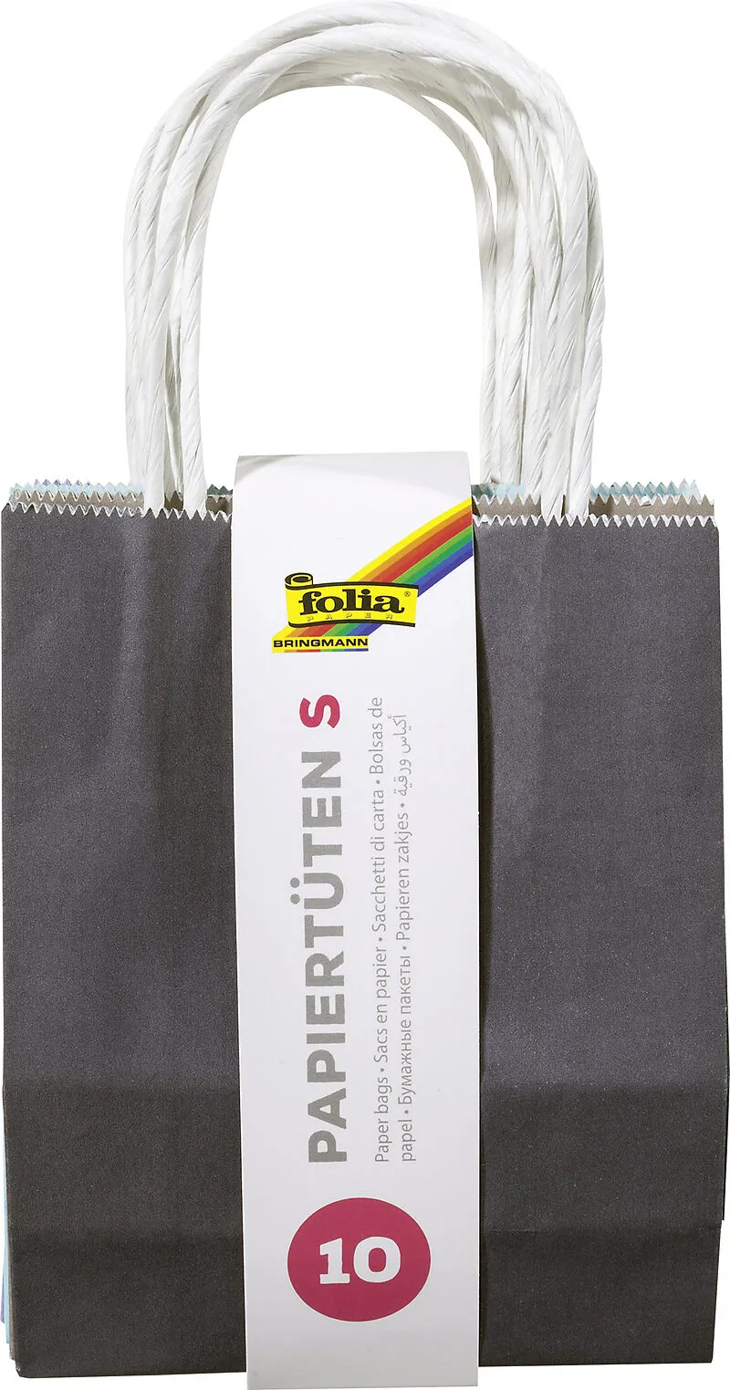 Papiertüten mit gedrehtem Tragegriff, in Trendfarben sortiert, aus 110 g/m Kraftpapier, 12x5,5x15 cm, 10 Stück farbig sortiert, jede Tüte mit Einzel-EAN versehen, Farben je 1x cappuccino, anthrazit, türkis, eisblau, mintgrün, lachs, rose, lila, violett, limone...