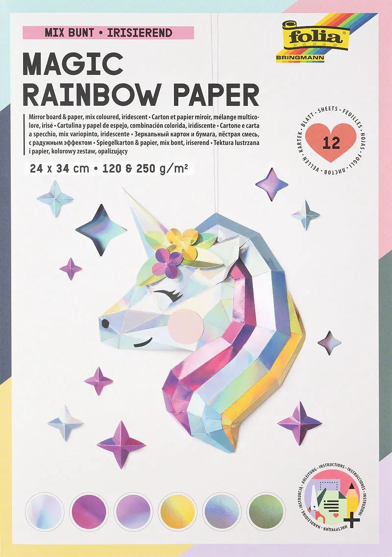 24 x 34 cm12 Blatt / sheets6 irisierende Farben sortiert / iridescent colours assortedeinseitig veredelt / one side finishedInhalt / content 6x Papier / paper, 120 g/m26x Karton / cardboard, 250 g/m2