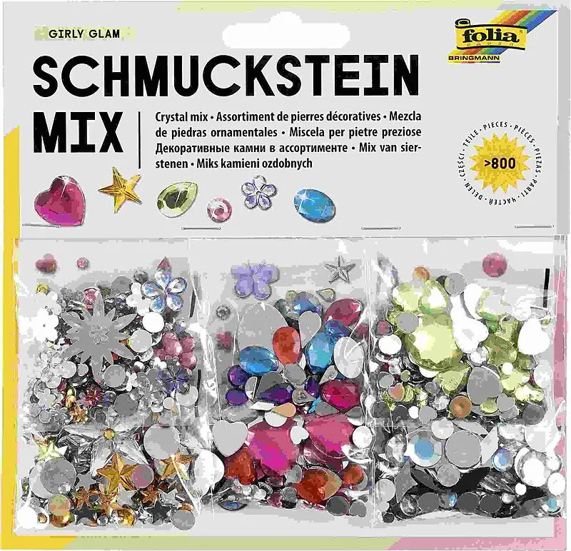 800 Schmucksteine aus Acryl, verschiedene Formen, Farben, Größen, verpackt in verschiedenen Beuteln auf farbig bedruckter Reiterkarte Über 800 farbenfrohe Schmucksteine in unterschiedlichen Größen, Formen und Farben. In 6 Beuteln farblich und thematisch sortie...
