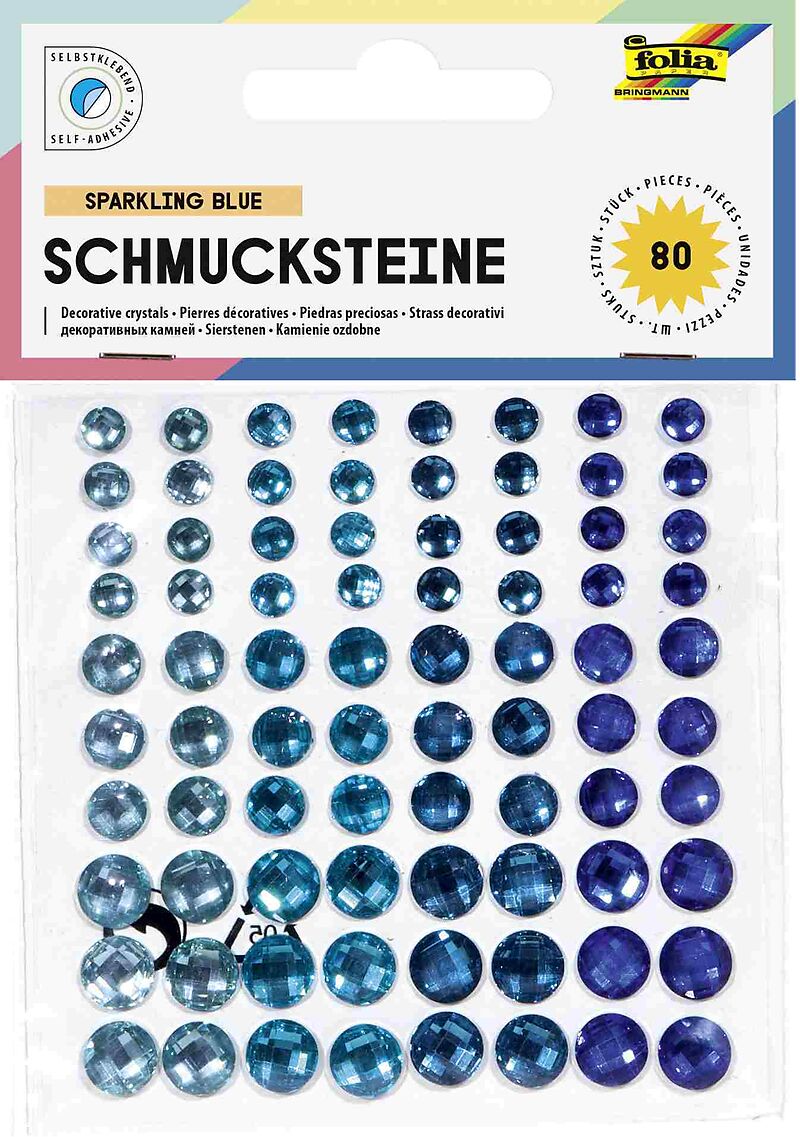 Verpackt im Polybeutel mit Reiterkarte, 4-farbig bedruckt, 80 Schmucksteine "Deep Ocean", selbstklebend, verschiedene Größen, LGA tested Schmucksteine selbstklebend, 80 Stück, Deep Ocean, Diese Packung enthält 80 harmonisch abgestimmte Schmucksteine Deep Ocean...