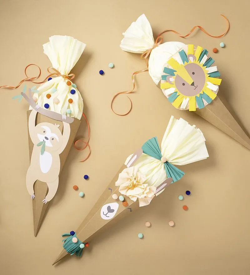 Bastelset für 1 Schultüte mit drei Motiven zur Auswahl: Lama, Löwe, Faultier inkl. Anleitung. 1 x Schultütenrohling, natur 4 x Krepppapier in 4 Farben 5 x Stanzbögen, 4/4 farbig bedruckt 15 x Pompons 150 cm Stickgarn, weiß 60 cm Satinband 3D Klebepads Doppelse...