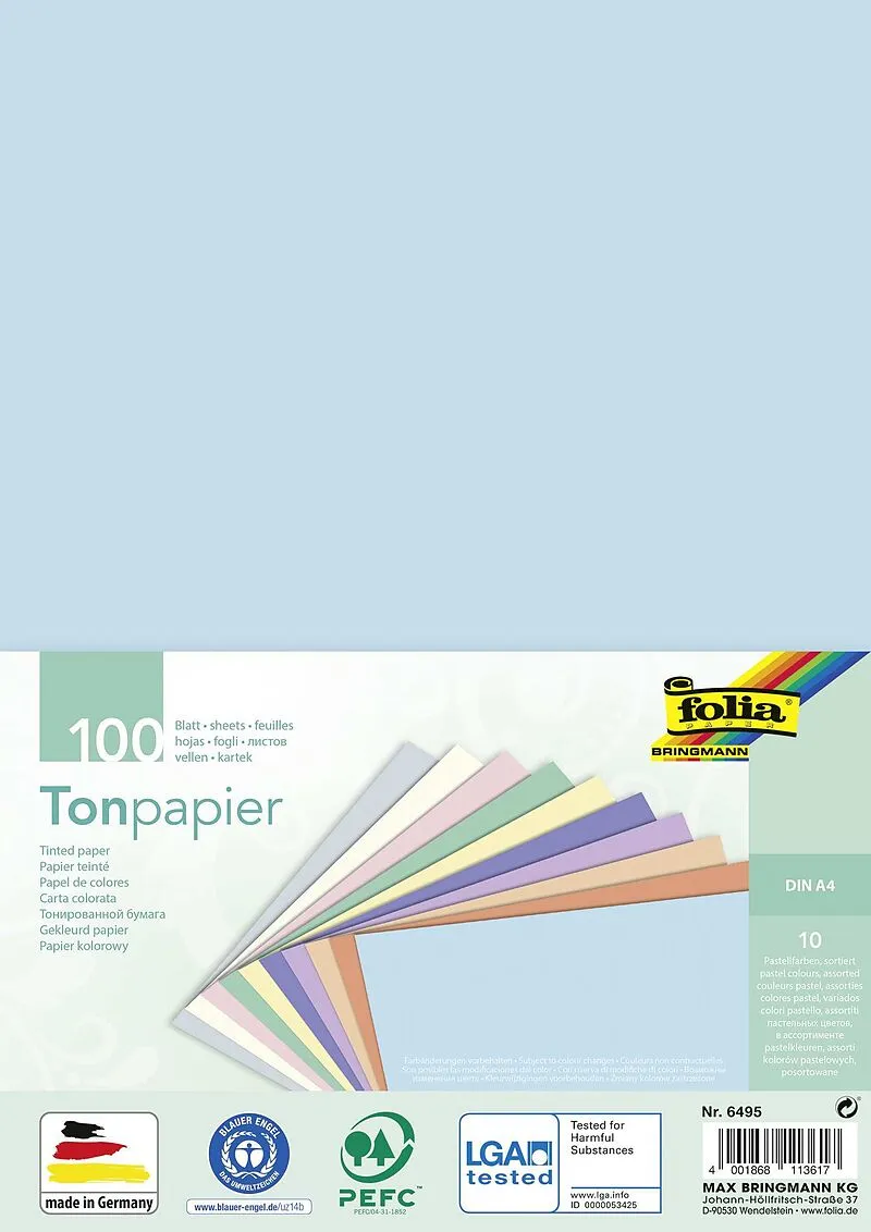 Tonpapier, 100 Blatt in 10 pastelligen Farben sortiert: eisblau, lachs, apricose, lila, veilchen, strohgelb, mint, hellrosa, perlweiß, hellgrau, Format DIN A4, Grammatur 130 g/qm, Made in Germany, Blauer Engel, PEFC, LGA tested, eingeschweißt in Folie mit 4 fa...