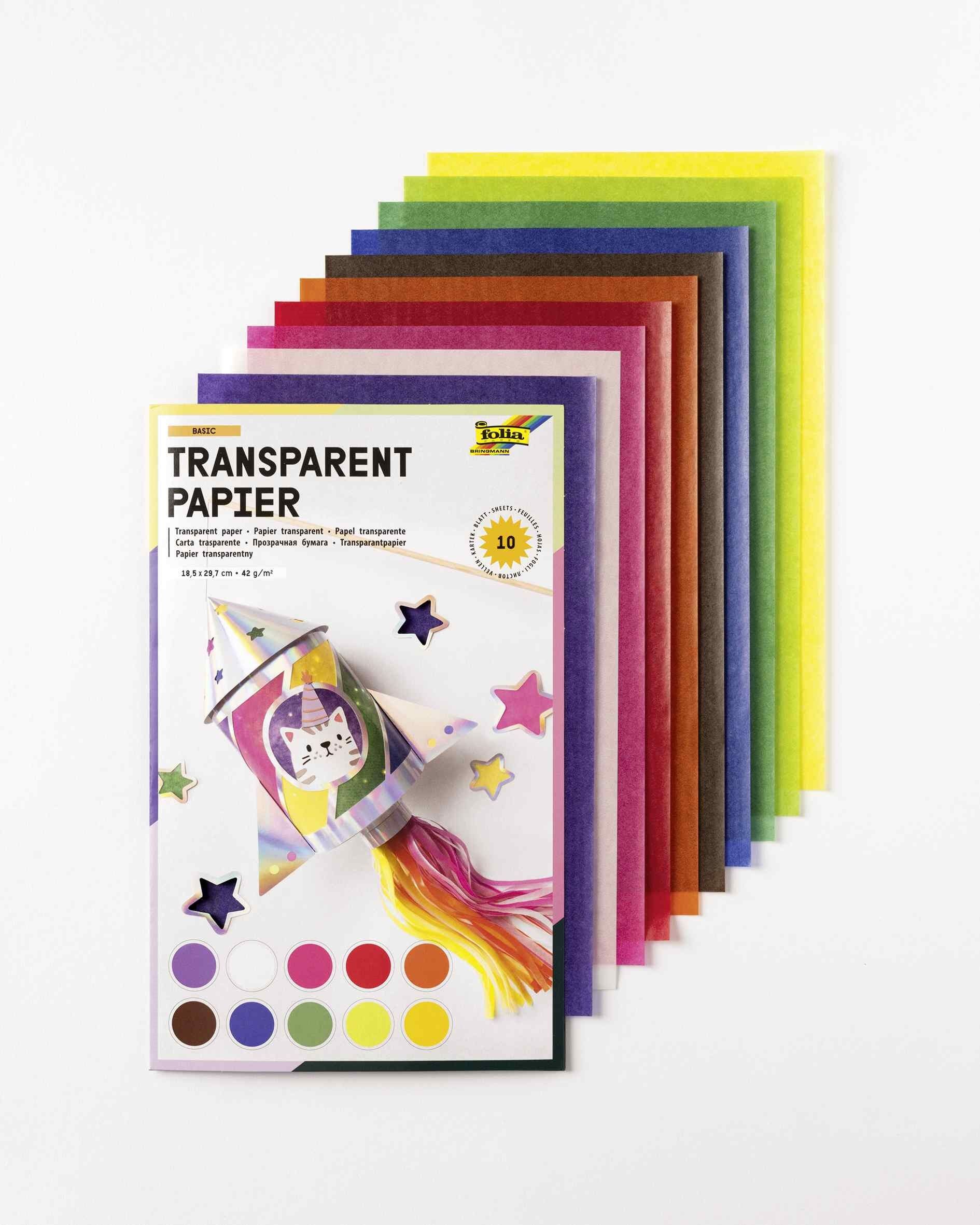 Transparentpapiermappe, 42 g/qm, 18,5 x 29,7 cm, 10 Blatt, 10 farbig sortiert, Farben rot, zitr.-gelb, hellgrün, dunkelgrün, weiß, blau, orange, violett, rosa, braun, mit Transparentpapier können Sie z.B. Windlichter, Weihnachtssterne, Grußkarten uvm. basteln ...