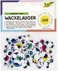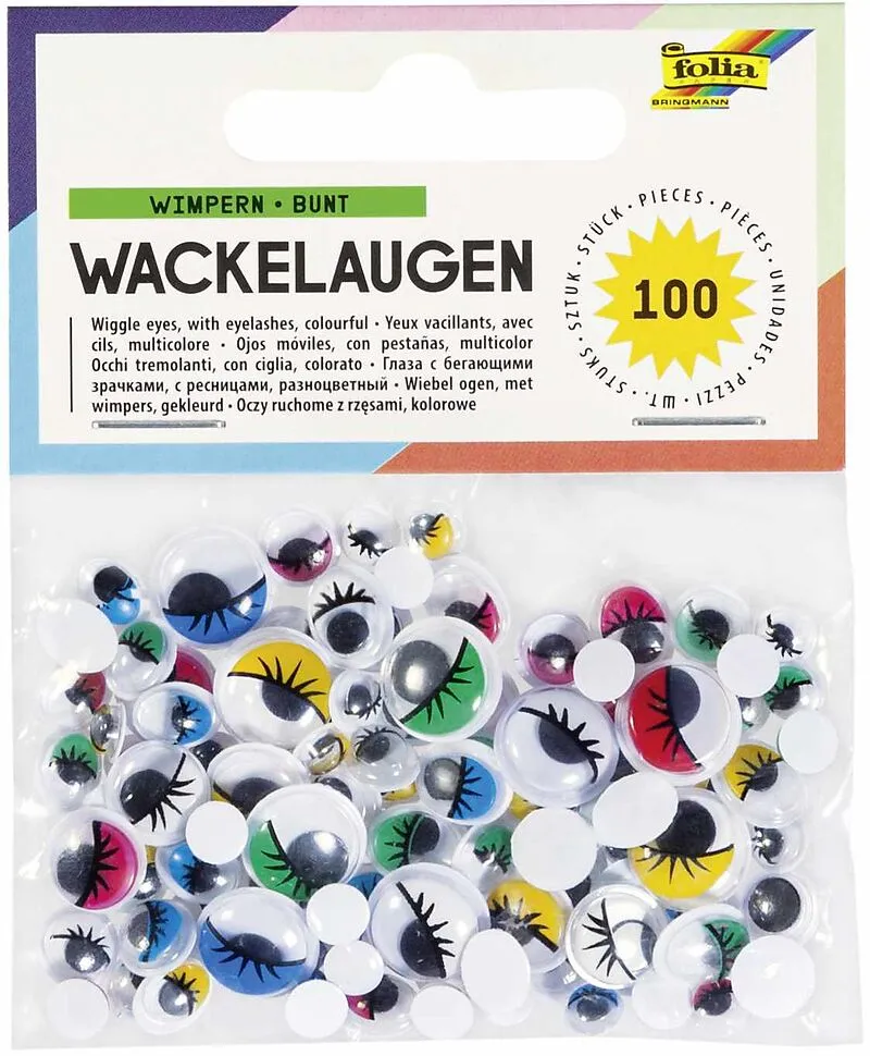 Wackelaugen mit Wimpern, 100 Stück in 6 Größen sortiert, Farbe weiß, gelb, rot, blau, grün, rund und oval, rund 6-12mm Durchmesser, oval 8x6mm & 10x8mm, nicht selbstklebend, verpackt im Polybeutel mit 4-farbig bedrucktem Reiter 100 Wackelaugen mit Wimpern und ...