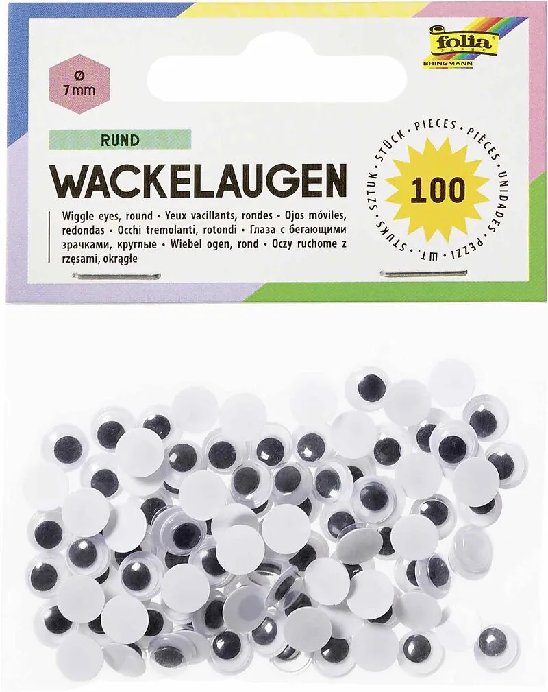 Wackelaugen, rund, 100 Stück, Farbe weiß, rund, Durchmesser 7 mm, verpackt im Polybeutel mit 4-farbig bedrucktem Reiter Mit diesen Wackelaugen verleihen Sie Ihren gebastelten Figuren ein Eigenleben. Auch als Verzierung für Karten, Dekorationen, Kindergartentas...