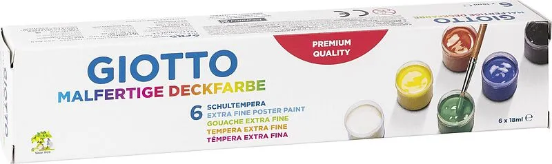 Farbe: blaugrün, ultramarinblau, gelb, zinnoberrot, schwarz, deckweiß; Inhalt: dickflüssige Farben in Bechern 18 ml; 6 Farben; leicht abwaschbar, wisch- und radierfest, für viele Maltechniken; für Papier, Holz, Keramik, Stein GIOTTO Malfertige Deckfarbe ist he...