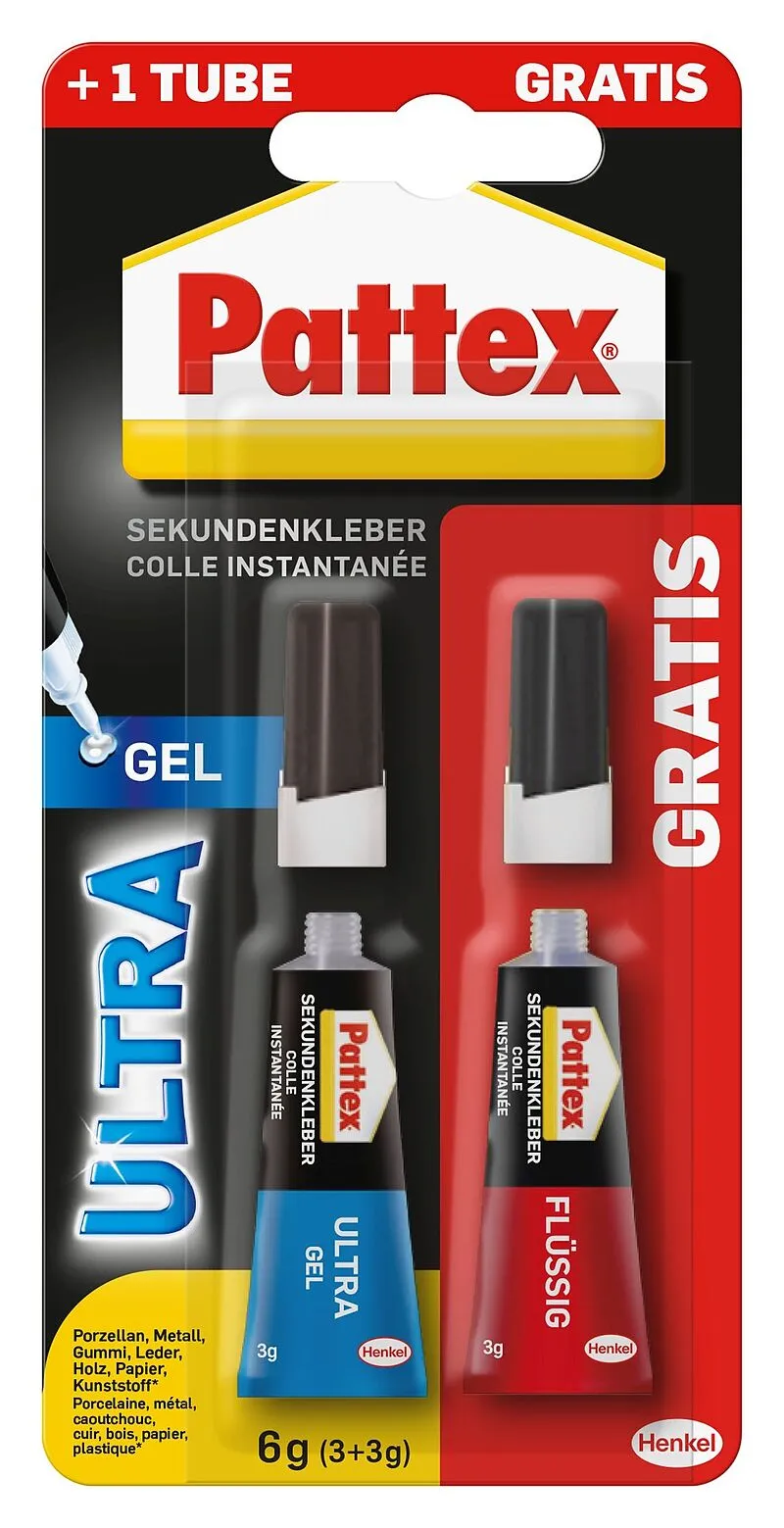 Pattex Sekundenkleber Ultra Gel, 3 g + gratis Sekundenkleber Flüssig, 3 g Pattex Sekundenkleber Ultra Gel 3 gExtra stark und flexibelVibrationsdämpfendStoß- und wasserresistentDurch die patentierte Henkel Rezeptur mit Mikro-Gummipartikeln besonders flexibelAu...