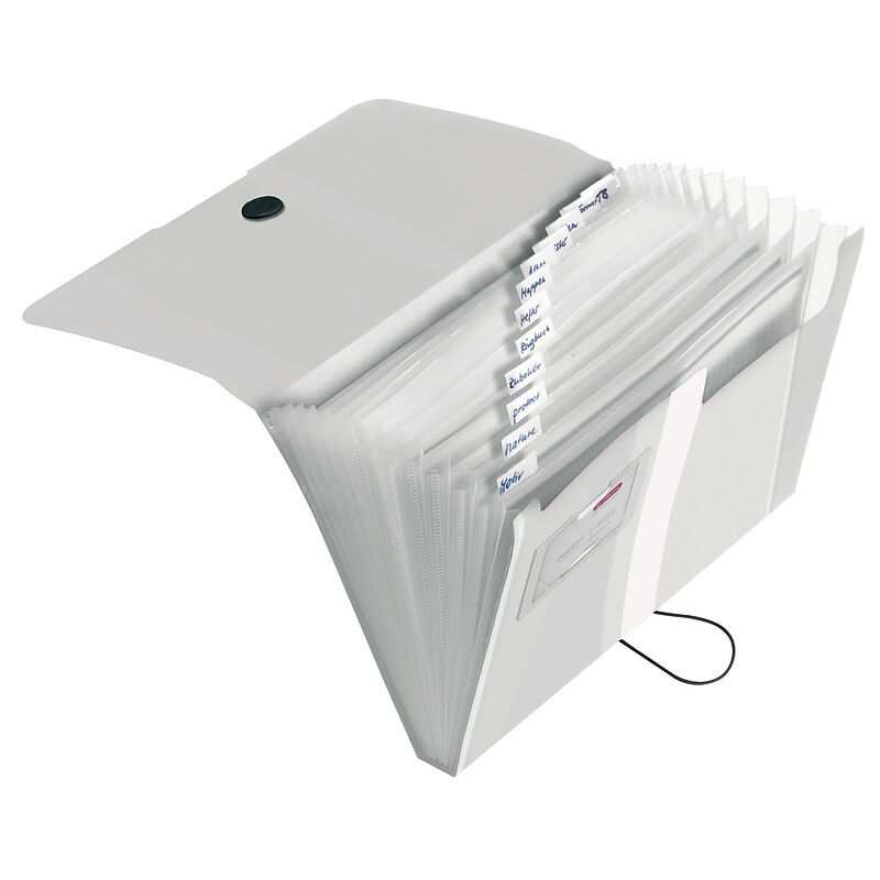 Fächermappe A4 PP 12 Fächer transparent farblos easy orga to go, Farbe des Fächerblocks: weiß bedruckt, Greifausschnitt vorhanden, runder Gummizug mit Verschlußknopf, mit Visitenkartenfach, Art des Verschlusses: Gummizug, Material des Einbandes: PP, Papiergewi...