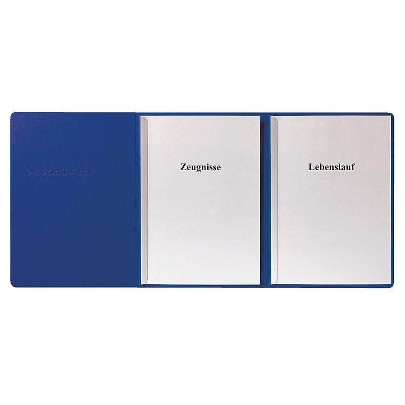 Recycling-Karton Bewerbungsmappe A4 3tlg. RC-Karton blau. - Karton-Bewerbungsmappe A4 3tlg. RC-Karton blau - Bewerbungsmappe mit 2 transparenten Klemmschienen und Ausstanzungen zum Befestigen des Anschreibens. Mit Prägung Bewerbung - Werkstoff: Karton - Verwen...