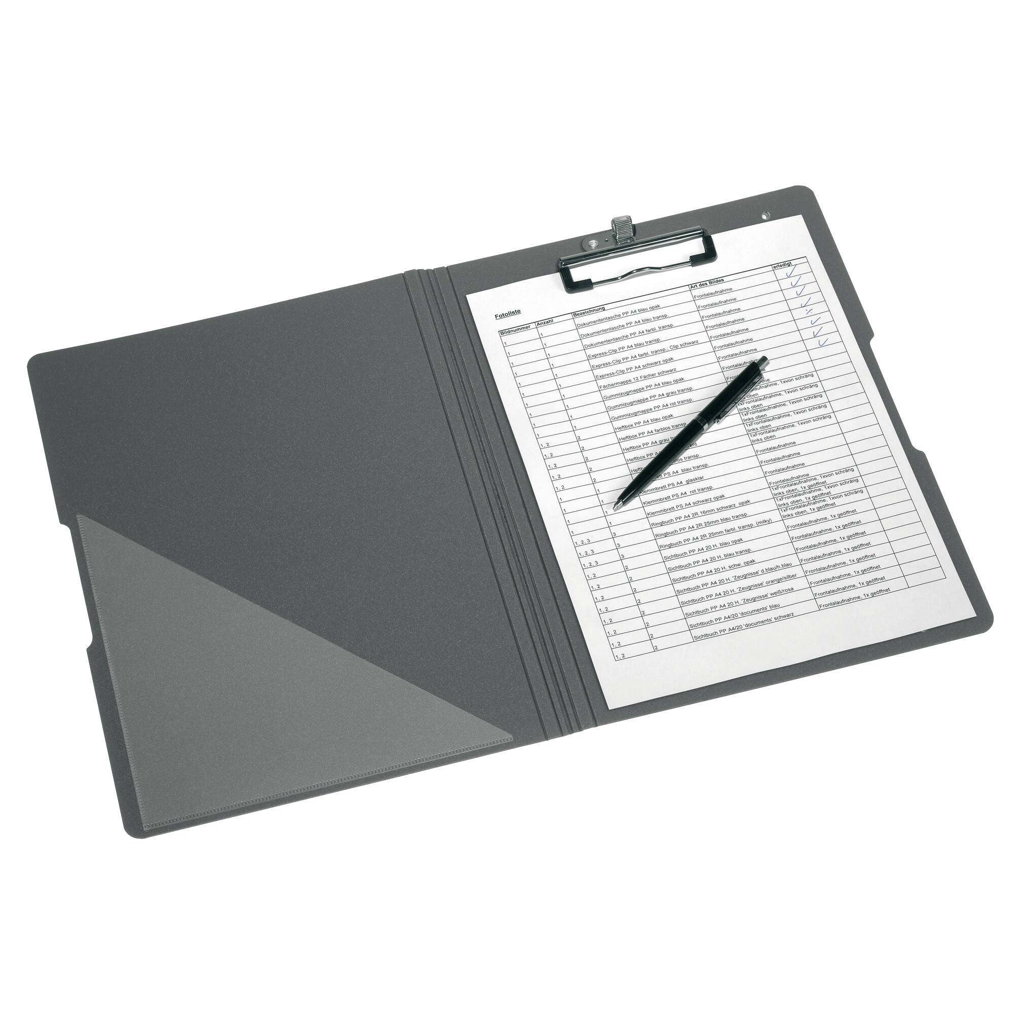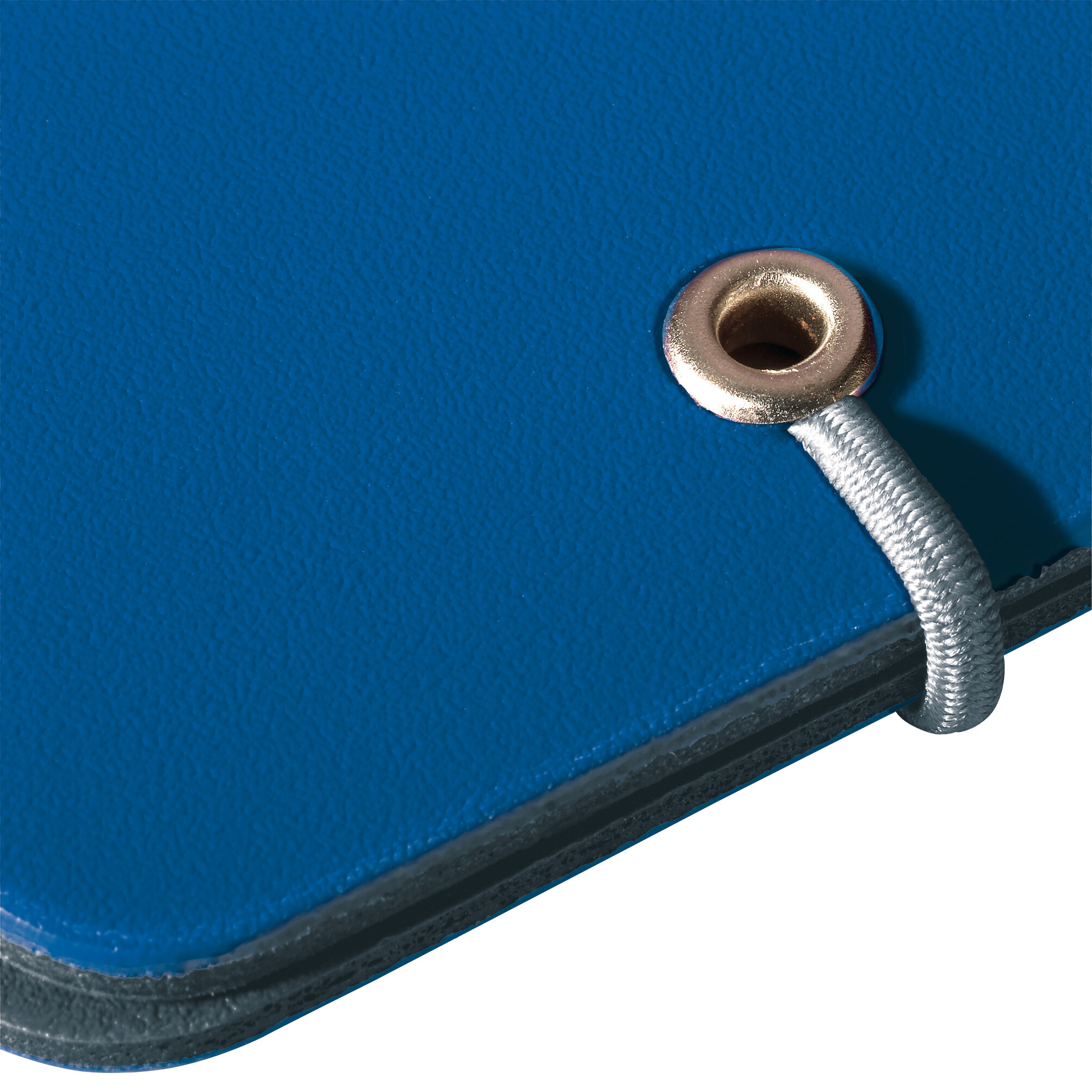 Polyfoam mit Design-Aufdruck, vernickelte Klemmmechanik, flexibler Stiftehalter mit Gummizug, Dreieckstasche im Vorderdeckel. Modell: blau. Preis pro Stück.