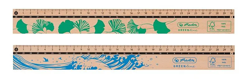 Lineal 30cm aus Holz, FSC 100%. Ausführung der Tuschekante: oberseitig. Das Lineal gibt es in zwei Motiven. Eine Motivwahl ist nicht möglich. Preis pro Stück.