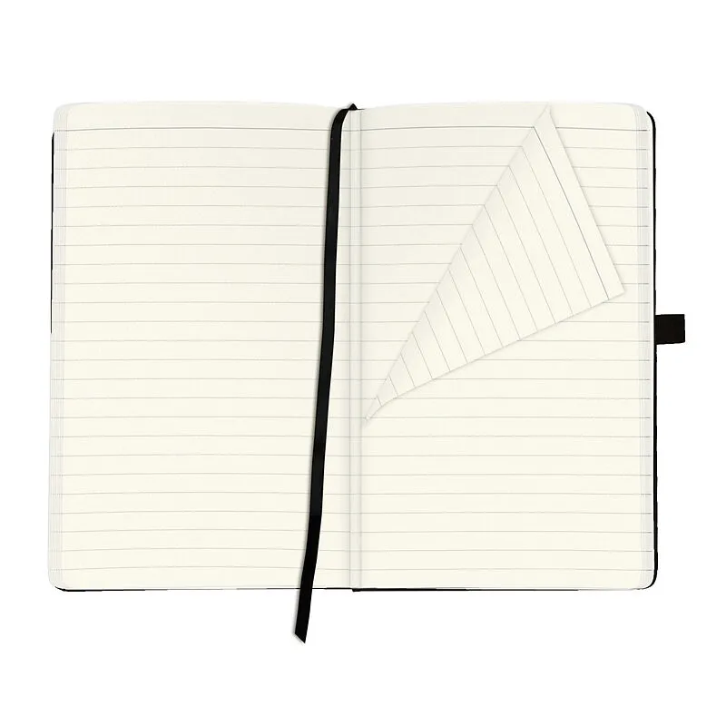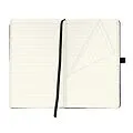 Holzfreies Papier, 80g/m creme 96 Blatt, liniert, Leseband Bezug Kunstleder schwarz, Stifteschlaufe mit Gummizug zum Verschließen mit 16 herausreißbaren Seiten mit Falttasche hinten.
