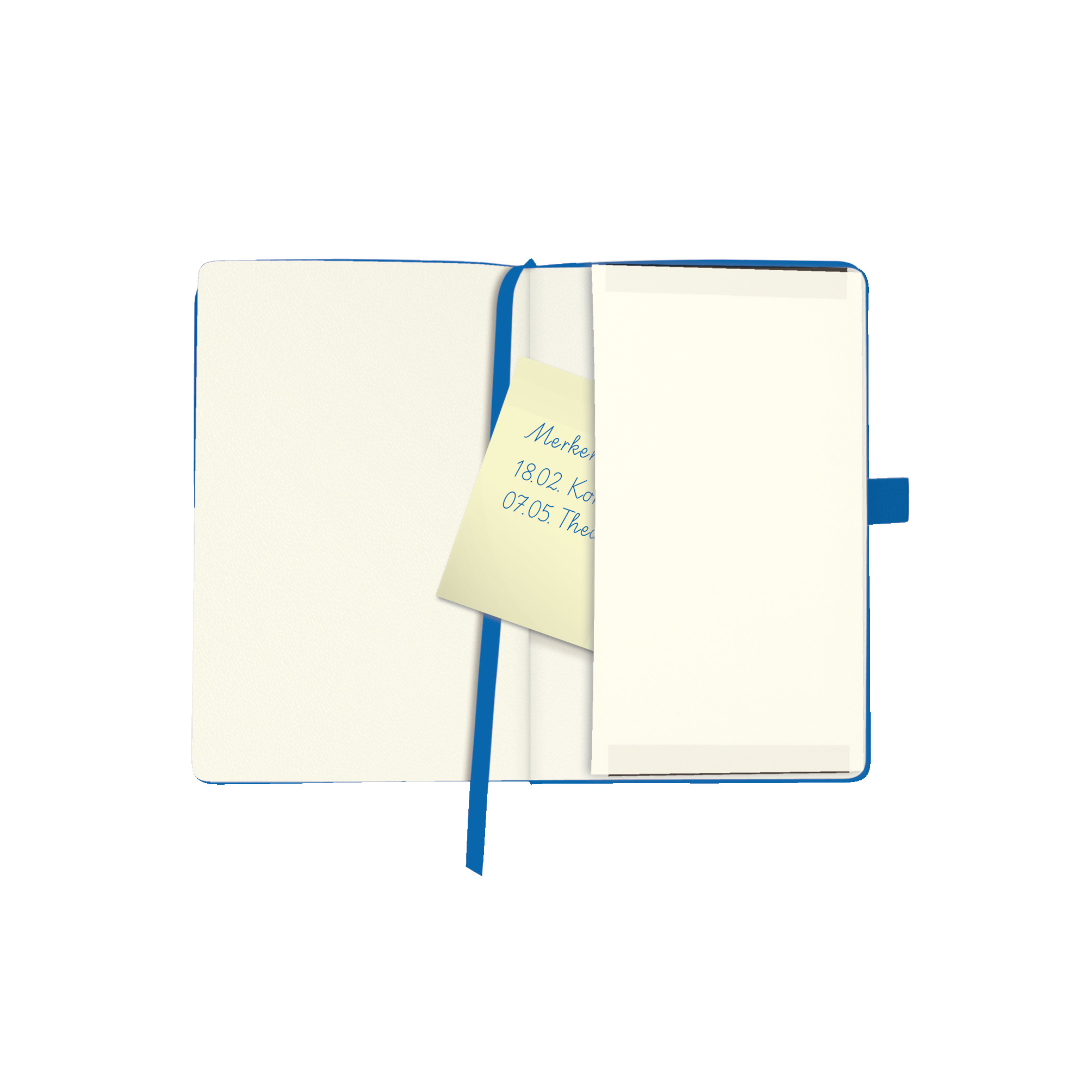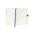 Holzfreies Papier, 80g/m creme, 96 Blatt, kariert, Leseband, Bezug Kunstleder blue, Stifteschlaufe, mit Gummizug zum Verschließen, mit 16 herausreißbaren Blättern, mit Falttasche hinten.