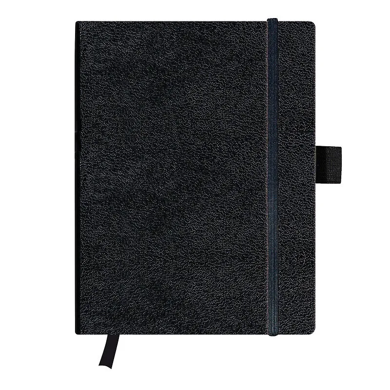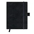 holzfreies Papier, 80g/m weiß, 96 Blatt, Sonderlineatur kariert, Leseband, Bezug Kunstleder schwarz, Stifteschlaufe, mit Gummizug zum Verschließen, mit 16 herausreißbaren Blätternmit Falttasche innen.